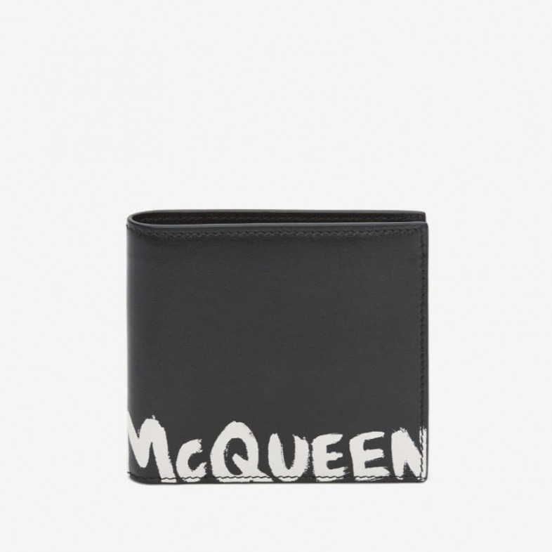 Black calfskin leather billfold wallet featuring a printed McQueen graffiti signature. The wallet has eight card slots, two flat pockets and two bill compartments. Finished with an Alexander McQueen signature.